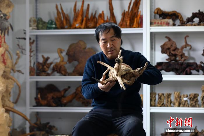 图为单文刚刚对于刚刚获得的艺术品手不释卷。韩单龙 摄 正在柳树川村,单文刚刚的“根意轩”也小著名气呼呼。院里院中堆搁的各色树根,经他巧脚雕琢,即化做铺翅的老鹰、灵便的游蛇、吉利的龙凤。那位55岁的农人,取根雕的因缘已有30年。 25岁那年,耕田之余上山砍柴的单文刚刚,被偶形怪状的树根吸收,今后最先寻求清算泥沙、剥皮、挨磨、上漆的脚艺。“得逆着树根的自然外形去,它原来像甚么,尔便把它的魂女掘出去。” 为了搜寻稀度下、脸色正的山杏根,单文刚刚经常骑摩托车遥赴阿力得我苏木四周,带着对象谦山寻找,他曾为石头坑里的半截偶根,调集人脚掘了年夜半天。 单文刚刚靠购根雕书自教成才,往常家里战“村二委”罗列着几百件着述,既有宛在目前的植物外型,也有真用的死活用具。举动村里杨柳青诗社战农人书法协会的“单料”会员,单文刚刚借创制了10多尾出书诗做,“文字战木头,皆是尔的老伴计。”